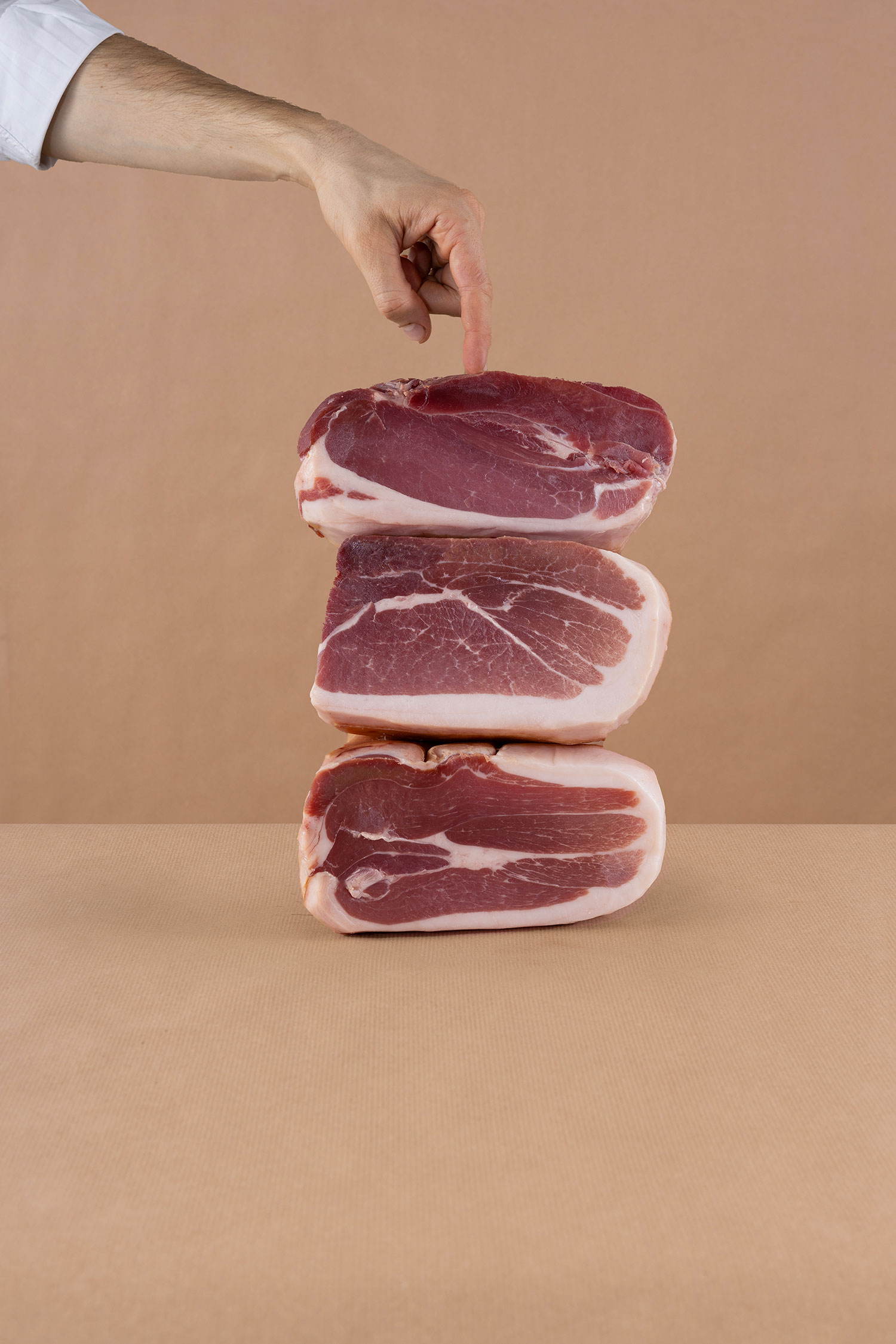 STINCO: la parte con il minor assorbimento del sale nel corso della lavorazione, essendo totalmente ricoperta dalla cotenna. Questo garantisce una delicatezza e una dolcezza superiori. Si può affettare sia a coltello che con l’affettatrice.