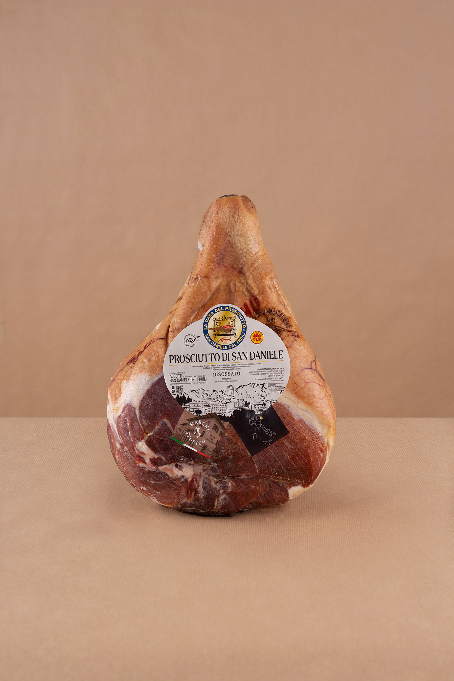 Conservare in frigorifero (tra +1°C e +7°C), ricoprendo il prosciutto con un canovaccio di cotone asciutto una volta tolto dall’involucro protettivo.