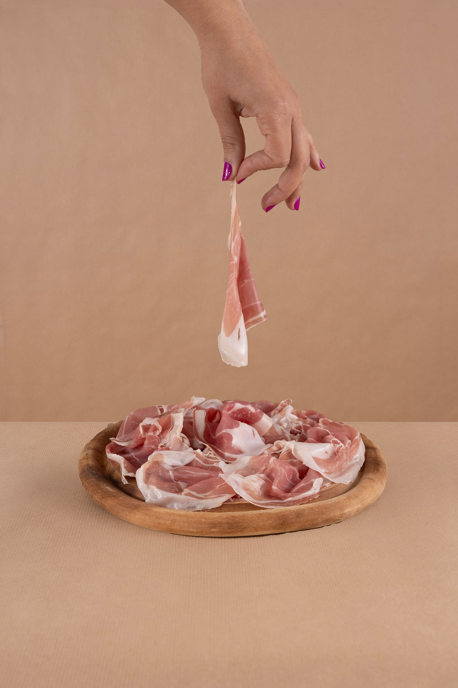 Consigliamo di tagliarlo sottile con l’affettatrice, in quanto lo stinco è la parte più morbida e tendinea del prosciutto e richiede una particolare attenzione durante la fase di affettamento.
